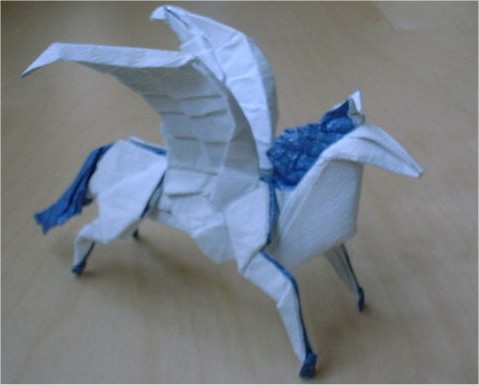 This model and the gryphon model are derived from a similar base. The mane and tail have been created by a turning a flap inside-out to show the coloured side of the square. These are then pleated to give the feathered effect.